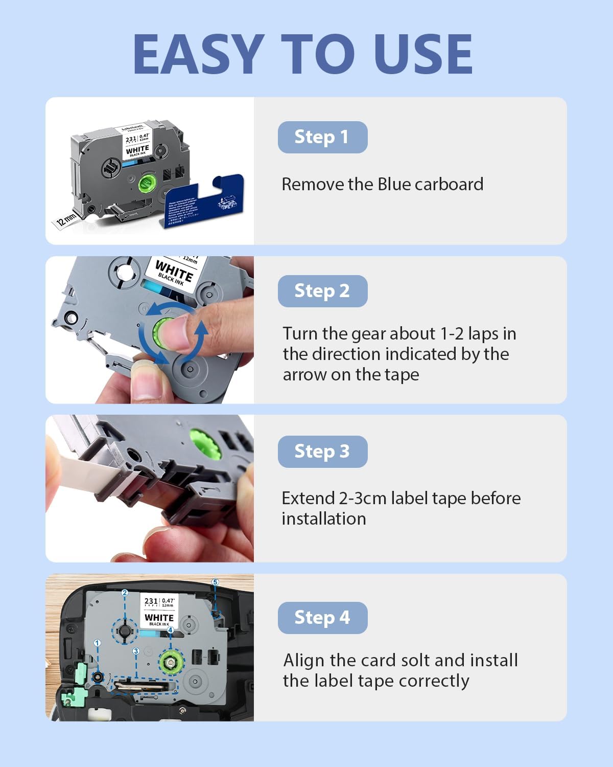 - Easy to use: These TZ-231 tape 12mm 0.47 Laminated White tapes comes with split backing design, the backing tape is split lengthwise in the middle for easy peeling, and all of Labelwell Laminated White TZe TZ Tapes with the feature of water resistant, temperature resistant, fade resistant, oil resistant, abrasion resistant, chemical resistant, and no sticky residue