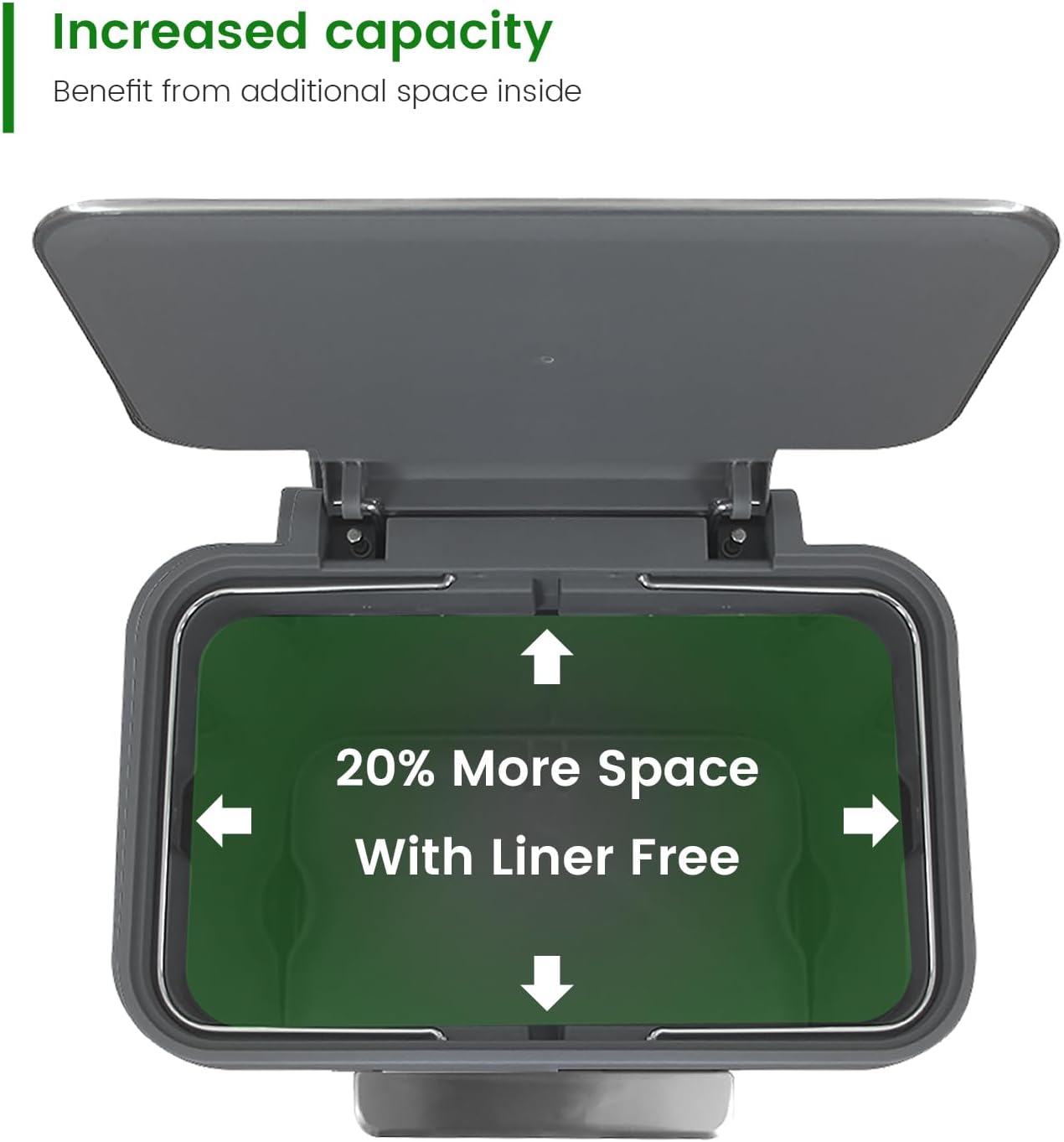 - Liner-Free & Secure: No inner bucket needed! The stainless steel 18 gal trash can features inner ring bag holders to keep trash bags securely in place, making cleanup quick and hassle-free.