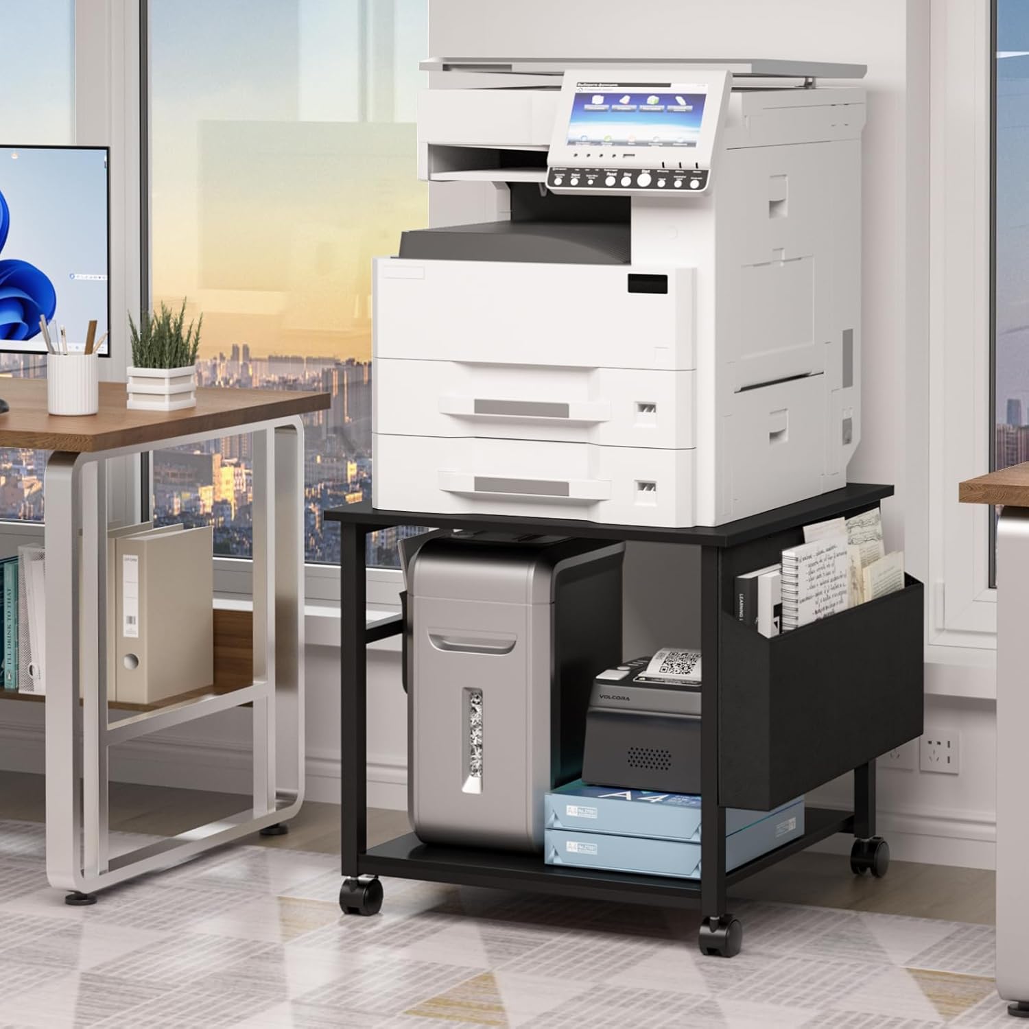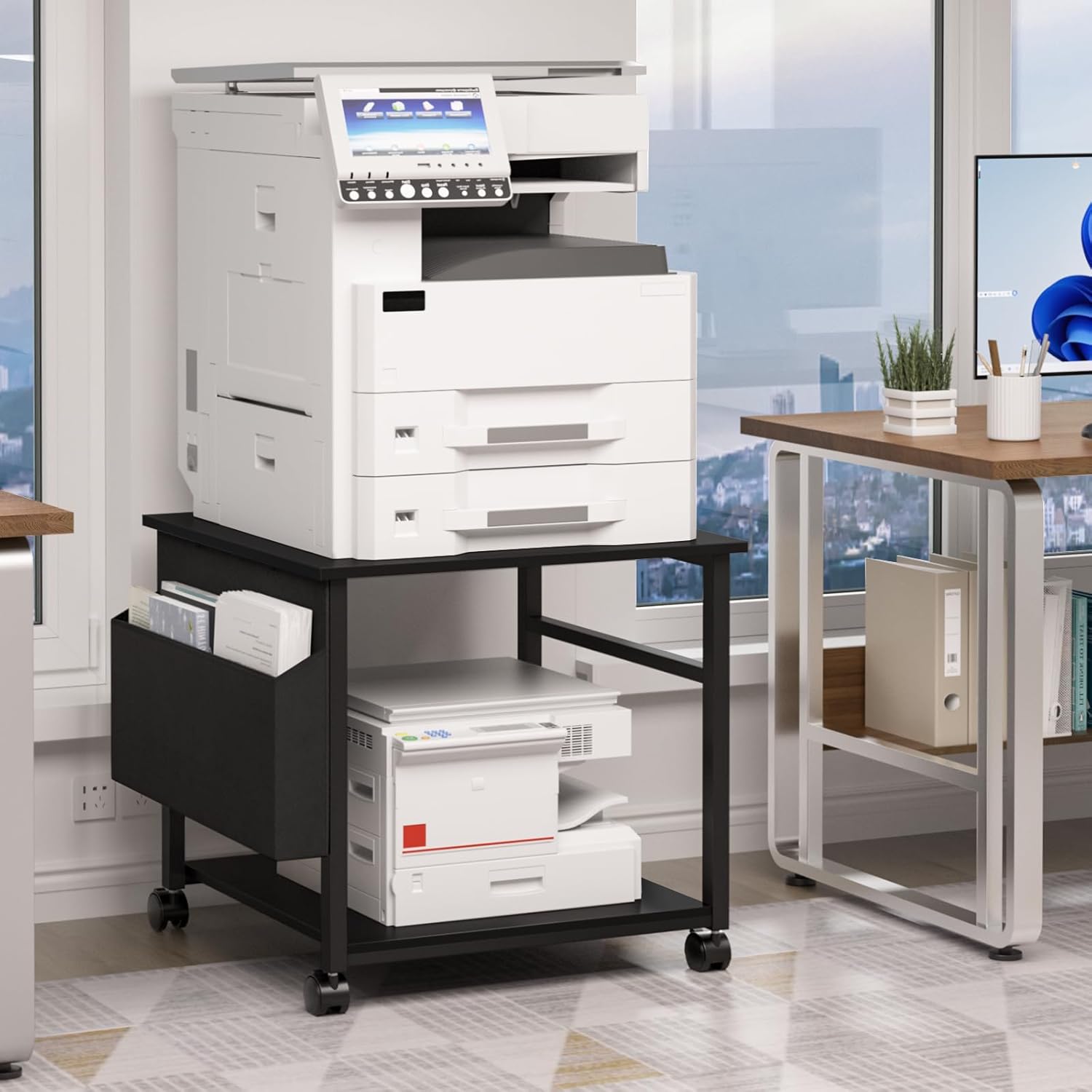 - Super Large Storage Space: The desktop of this large printer stand adopts a 23.6" square design, with each layer having a load-bearing capacity of up to 150 pounds, easily accommodating various large printers and bulky equipment.The two-tier storage design and side storage bag (which can be freely installed on either side) provide ample space for your printer paper and various office supplies, keeping everything neat and organized.