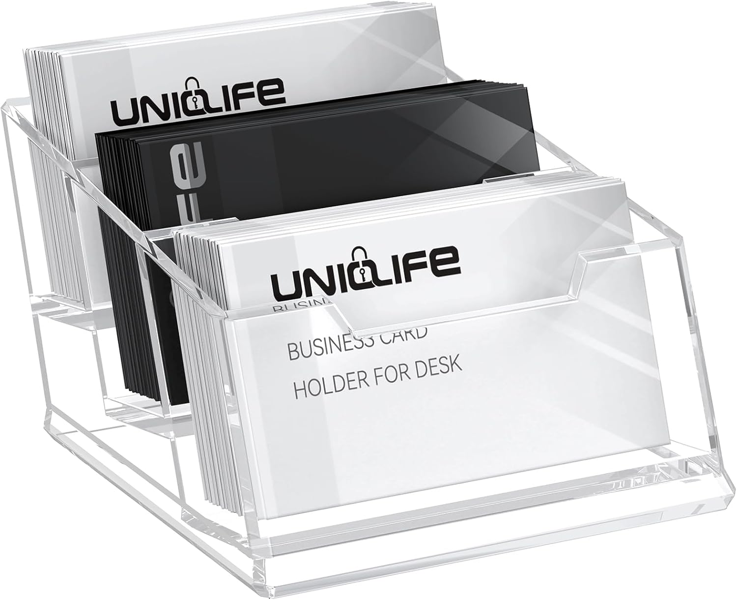 Uniclife Acrylic Business Card Holder for Desk 3 Slots Clear Business Card Display Stand for Men & Women Desktop Business Card Organizer Card Stand for Office Home Exhibition, 180 Card Capacity