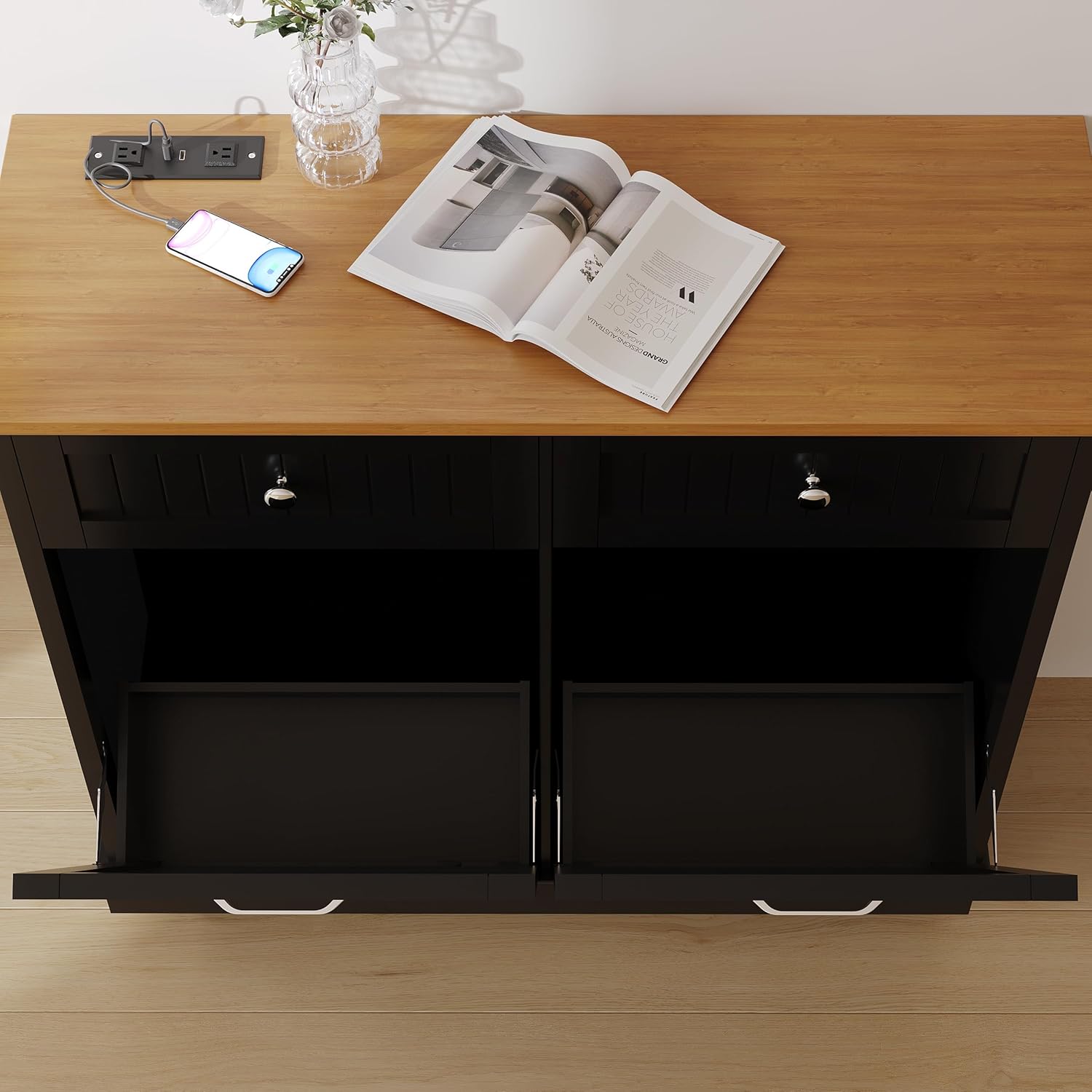 20 Gallon Tilt Out Trash Cabinet, Wooden Kitchen Trash Can Cabinet with Hideaway Drawer, Freestanding Laundry Hamper Garbage Recycling Cabinet on Wheels, Pet Proof, Double, Black