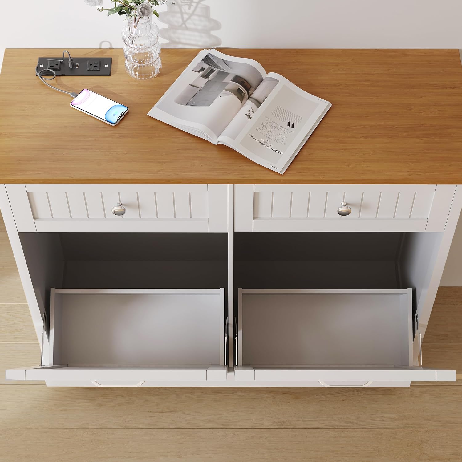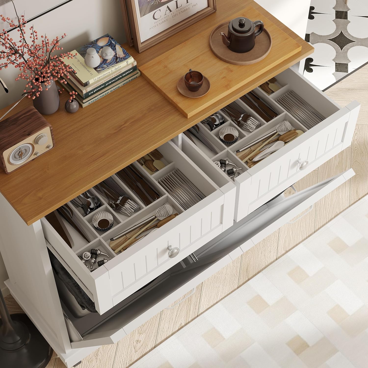 20 Gallon Tilt Out Trash Cabinet, Wooden Kitchen Trash Can Cabinet with Hideaway Drawer, Freestanding Laundry Hamper Garbage Recycling Cabinet on Wheels, Pet Proof, Double, White