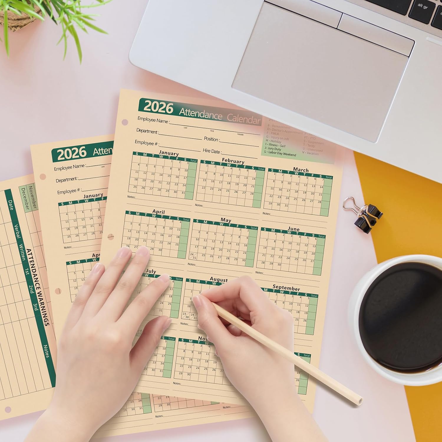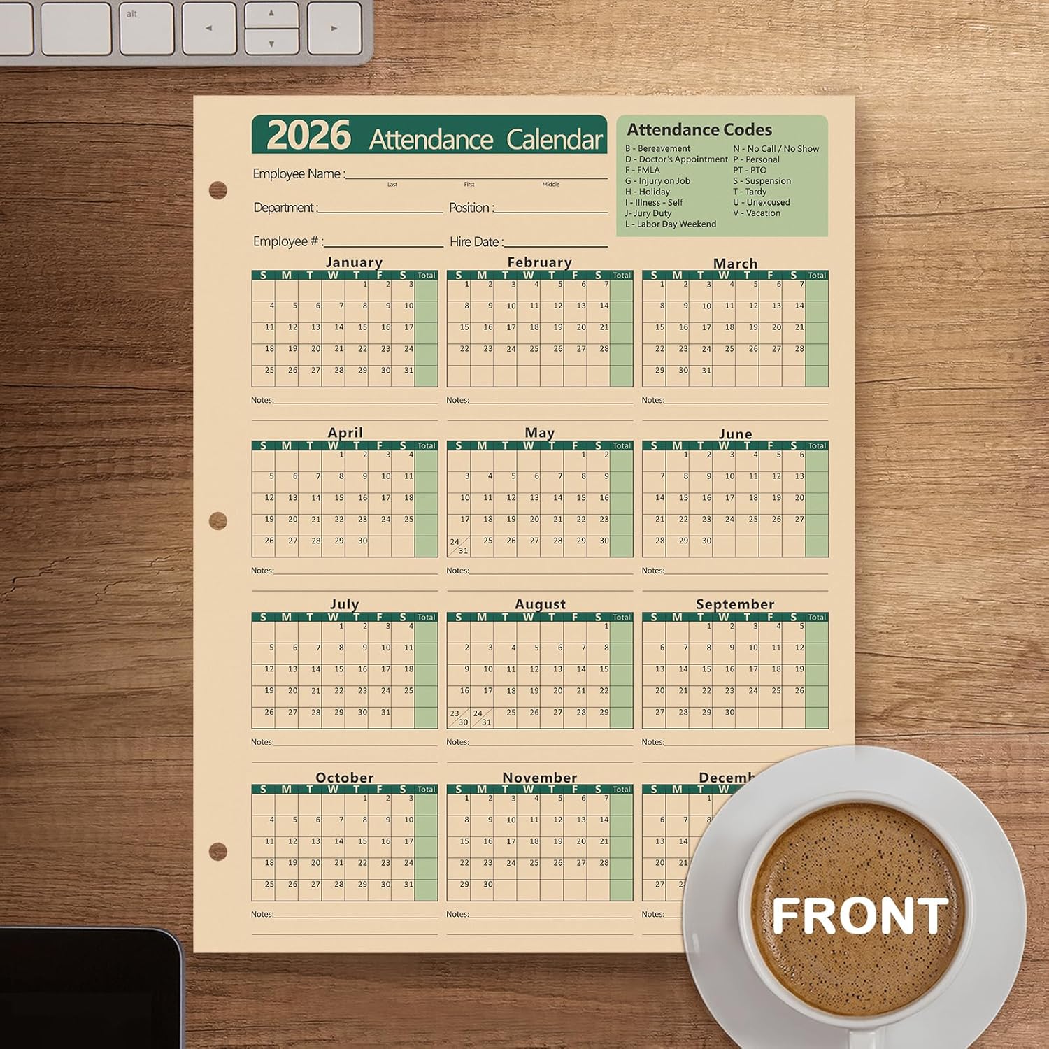 - The Employee Work Tracker Attendance Calendar has 3 hole punches on the side to fit standard three ring loose leaf binders,convenient for storage and organization.