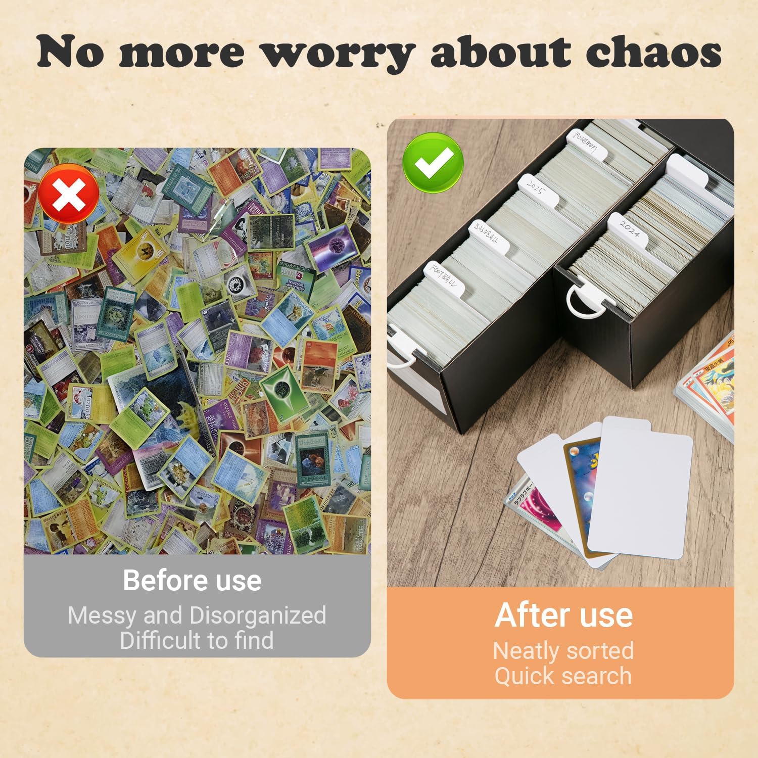 - FOLDABLE AND WIRTABLE TABS:The mtg card dividers feature a pre-scored tab at the top, allowing easy labeling without tearing or cracking. Fold up for quick indexing, fold down for tight storage — it’s your choice. Write with pen or marker to organize by name, set, game, or value. This smart design makes finding and categorizing cards effortless, even in high-volume collections