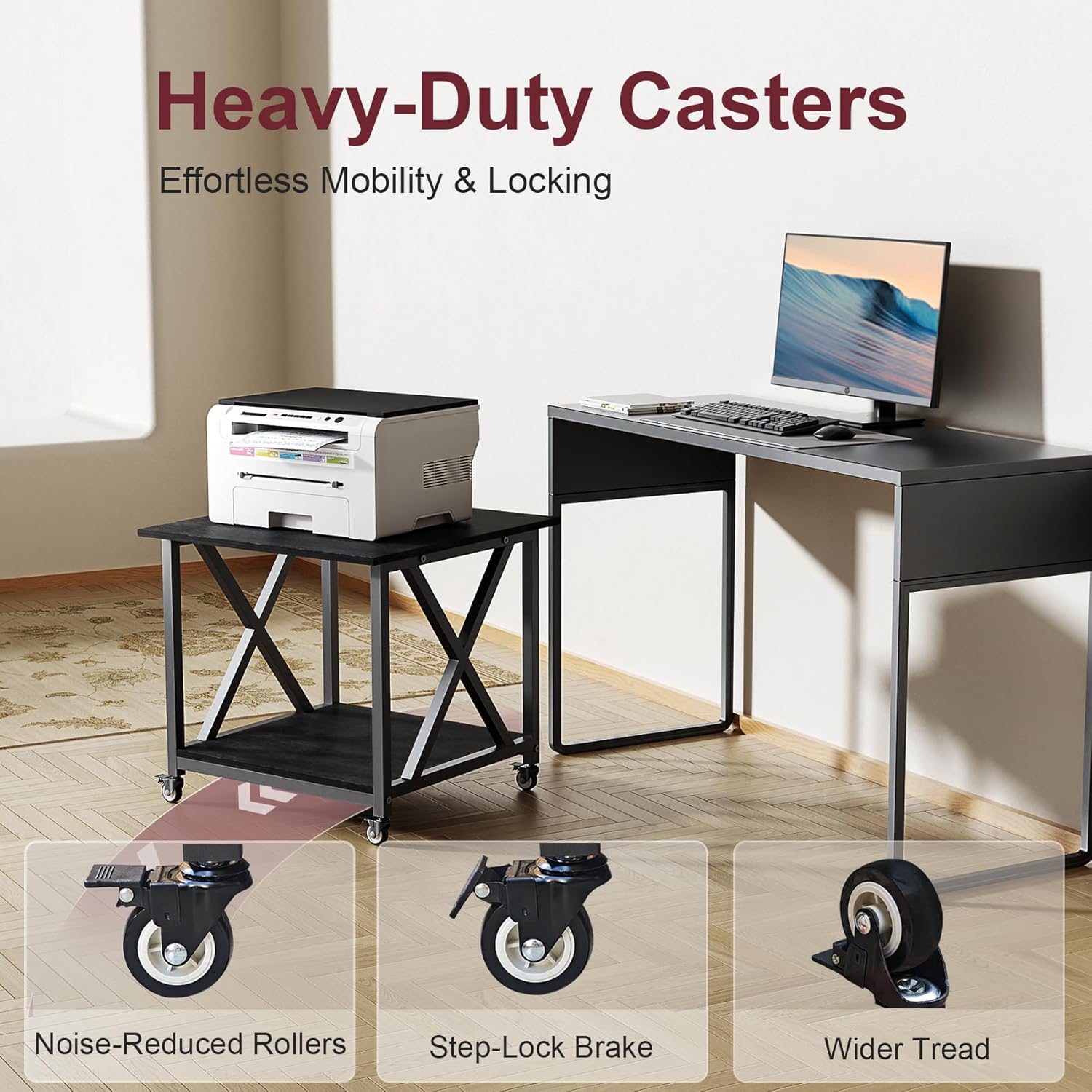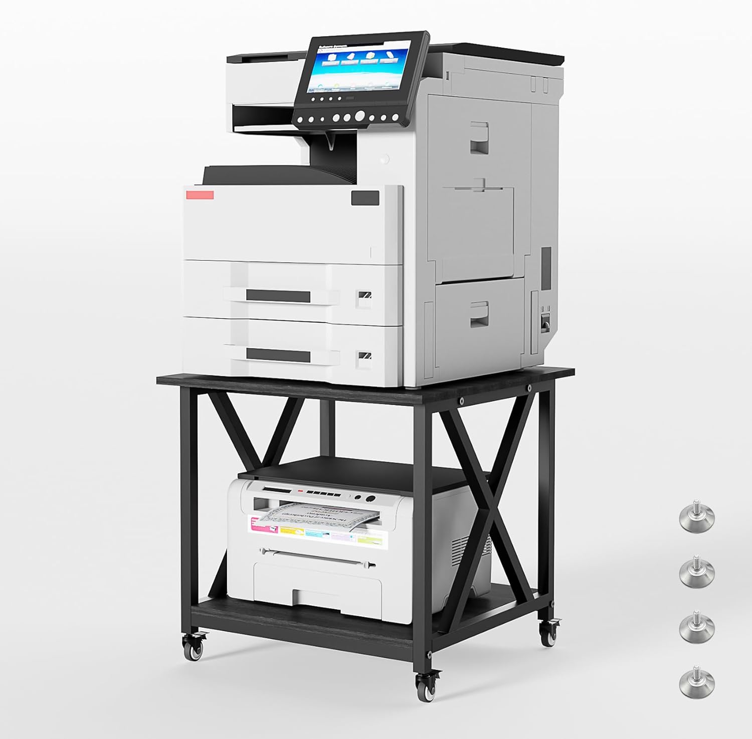 - 【Wheels and Feet Included】 Featuring industrial wheels, this printer cart glides smoothly even when fully loaded or used on carpet. All four wheels come with foot-operated brakes, so you can lock the cart in place effortlessly. Included anti-slip pads can be fine-tuned on uneven floors, ensuring the printer stand stays stable and wobble-free at all times.