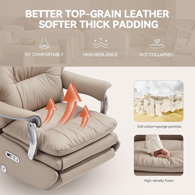 - Genuine Leather & Ergonomic Support: Crafted from breathable, skin-friendly and easy-to-clean genuine leather, this ergonomic office chair is built to offer both durability and comfort. With thick and soft seat cushion padding, wide armrests, and ergonomically curved backrest design, this office chair recliner is designed for extended use, providing exceptional back and lumbar support. A perfect choice for those who appreciate a luxury office chair. (Note: Only the contact surface is genuine leather)