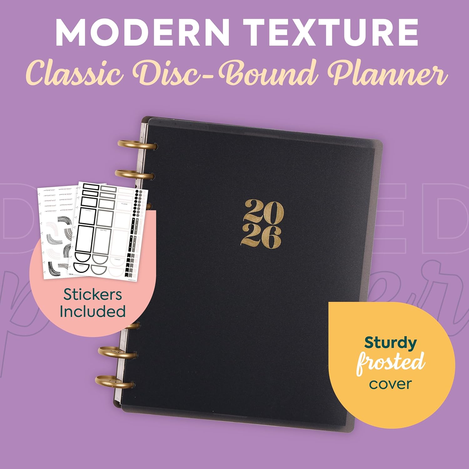 Happy Planner Disc-Bound Planner Jan.–Dec. 2026, Includes 3 Extra Months and 2 Sticker Sheets, Classic Size, 7" x 9.25", Dashboard Layout, Modern Texture