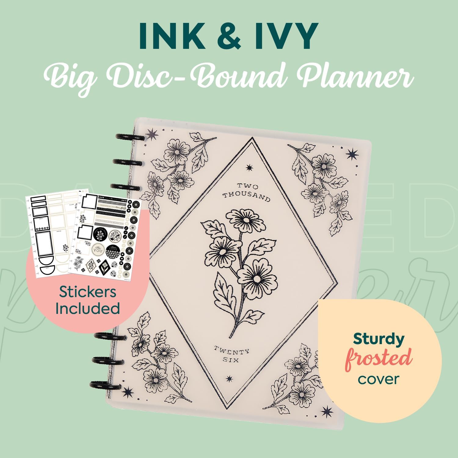 - DESIGN: This 12-month tabbed weekly planner includes 12 months of calendars and weekly spreads, 3 extra months, 2 sticker sheets, and premium-weight paper. The sturdy frosted covers protect the pages, and the plastic discs allow you to customize with accessories.