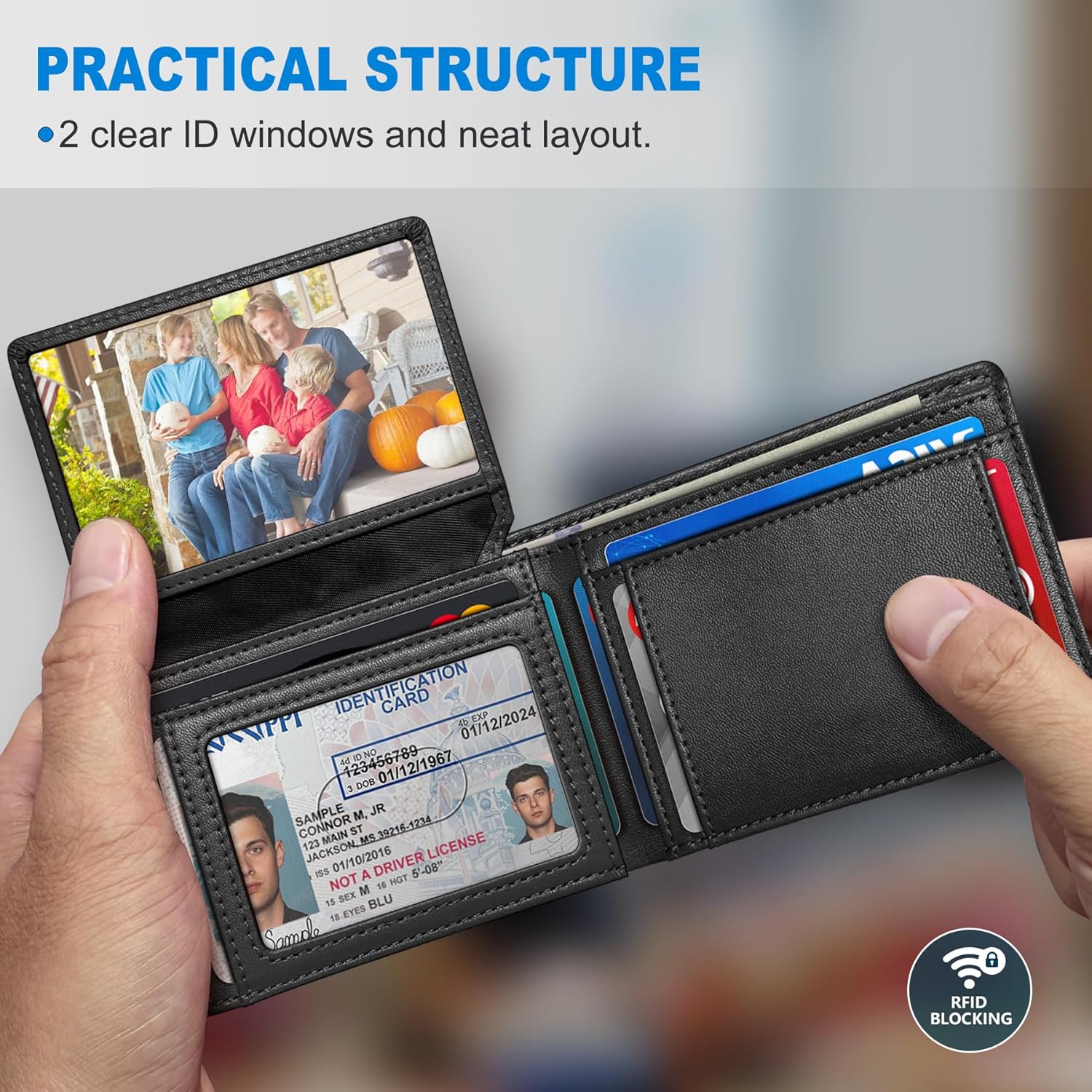 - PRACTICAL STRUCTURE--Stay organized and efficient with a logically laid-out design: 2 ID windows (for driver’s license & other IDs) and 3 quick-access slots let you grab essentials in a flash—whether traveling, shopping, or at work. Plus a roomy bill compartment. Ultimate convenience, simplified.