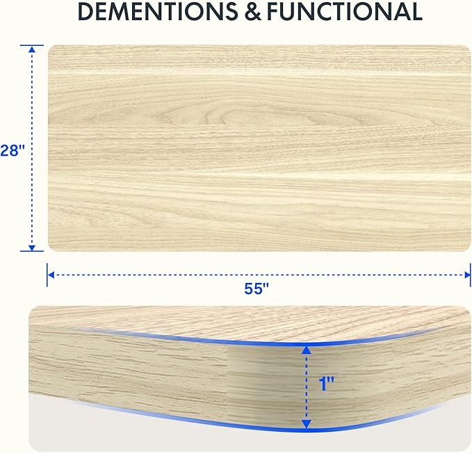 - AMPLE WHOLE-PIECE DESKTOP: With its whole-piece 1” eco-friendly desktop, this standing desk provides plenty of room for your computer setup, documents, and accessories, creating a well-organized and productive work environment. Due to hand measurements, desktop dimensions may vary slightly by 0 to 3”.
