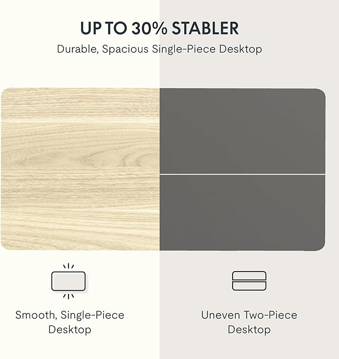 - AMPLE WHOLE-PIECE DESKTOP: With its whole-piece 1” eco-friendly desktop, this standing desk provides plenty of room for your computer setup, documents, and accessories, creating a well-organized and productive work environment. Due to hand measurements, desktop dimensions may vary slightly by 0 to 2”.