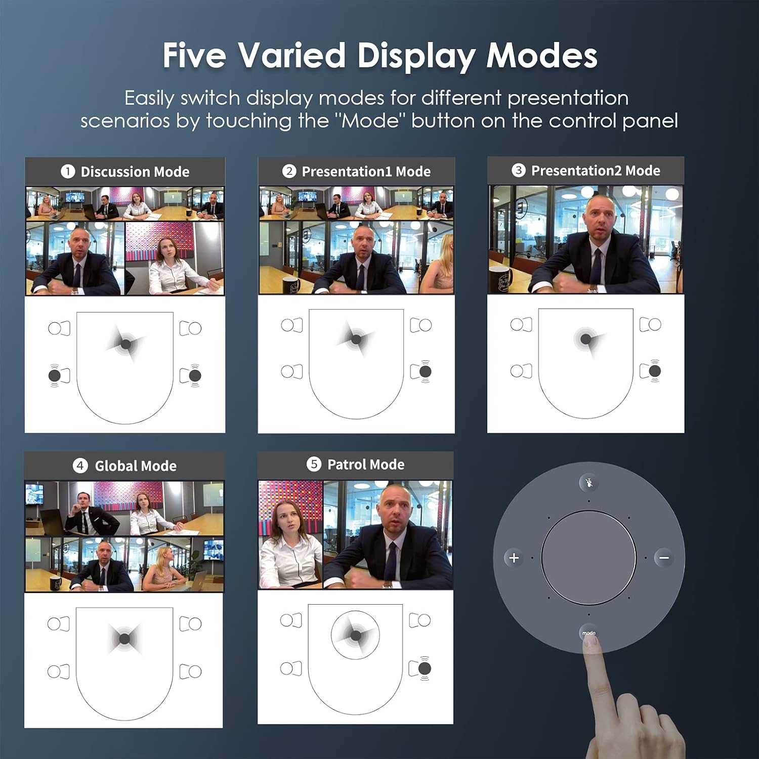 - 【8 Mics & Dual 10W Speakerphones】8 omnidirectional microphones pick up voice up to 18ft away, filter out background noise and echo, and deliver crystal-clear audio. Integrated dual 10w full-duplex speakerphones remove interference noise and echo and transmit crisp sound so you can hear the other party clearly. Volume+ / Volume- / Mute buttons on the camera panel are convenient to control audio volume and mute the microphones during the meeting.
