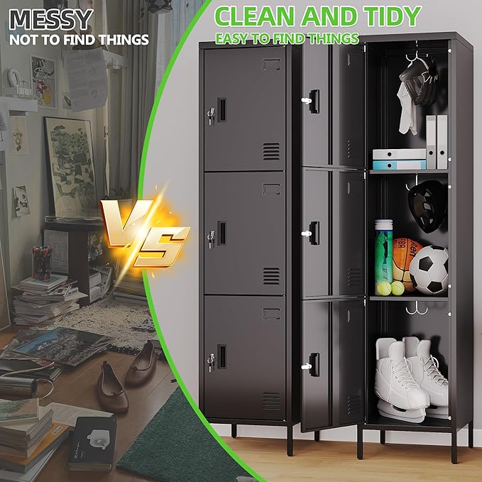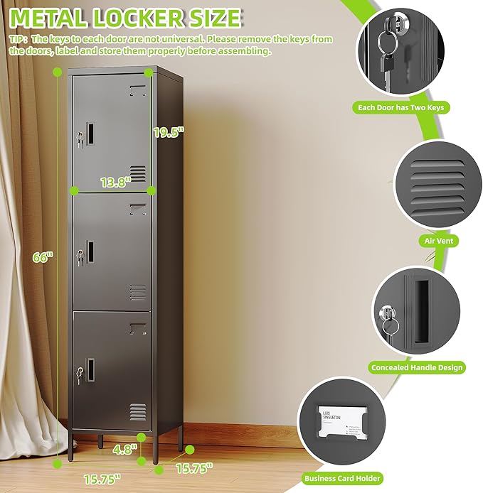 - Sleek Black Aesthetic:This 3 door metal storage locker in a stylish black color not only offers secure storage but also adds a modern touch to any home, office, or gym environment. With dimensions of 66.18"H×15.75"W×15.75"D, it provides ample space without taking up too much floor area.