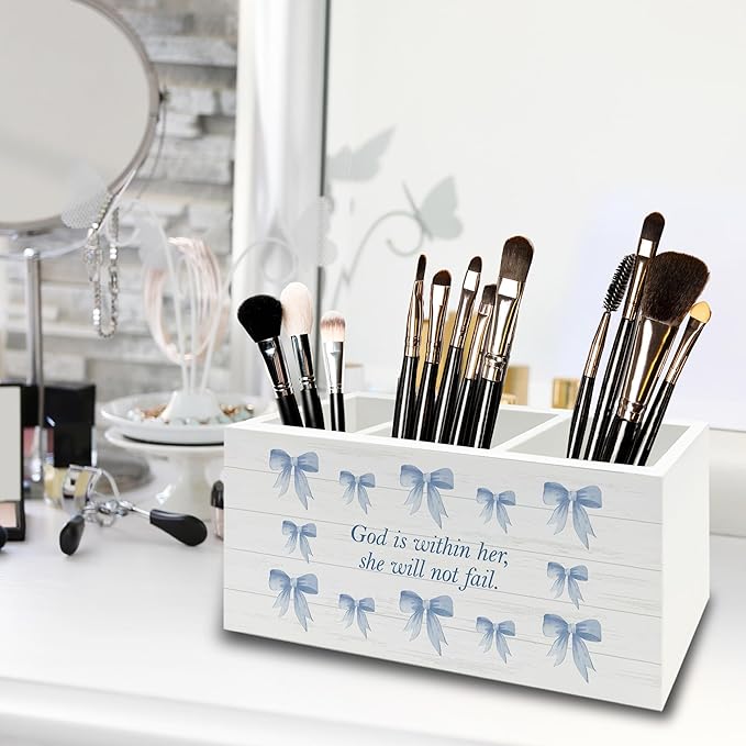 Blue Coquette Bow Christian Pen Pencil Holder Organizer for Desk, Preppy Desk Decor, Christian Gifts for Women, Bible Verse Wooden Box Sign for Girly Room Bedroom Dorm Tabletop Decorations