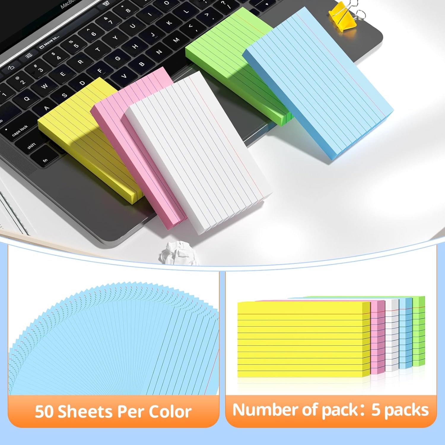 Colored Index Cards 3 X 5, 250 Count, Flash Cards For Studying, Lined Flashcards Notecards, Study Card, Ruled Front And Blank Back, Heavy Note Cards For Office, Home And School