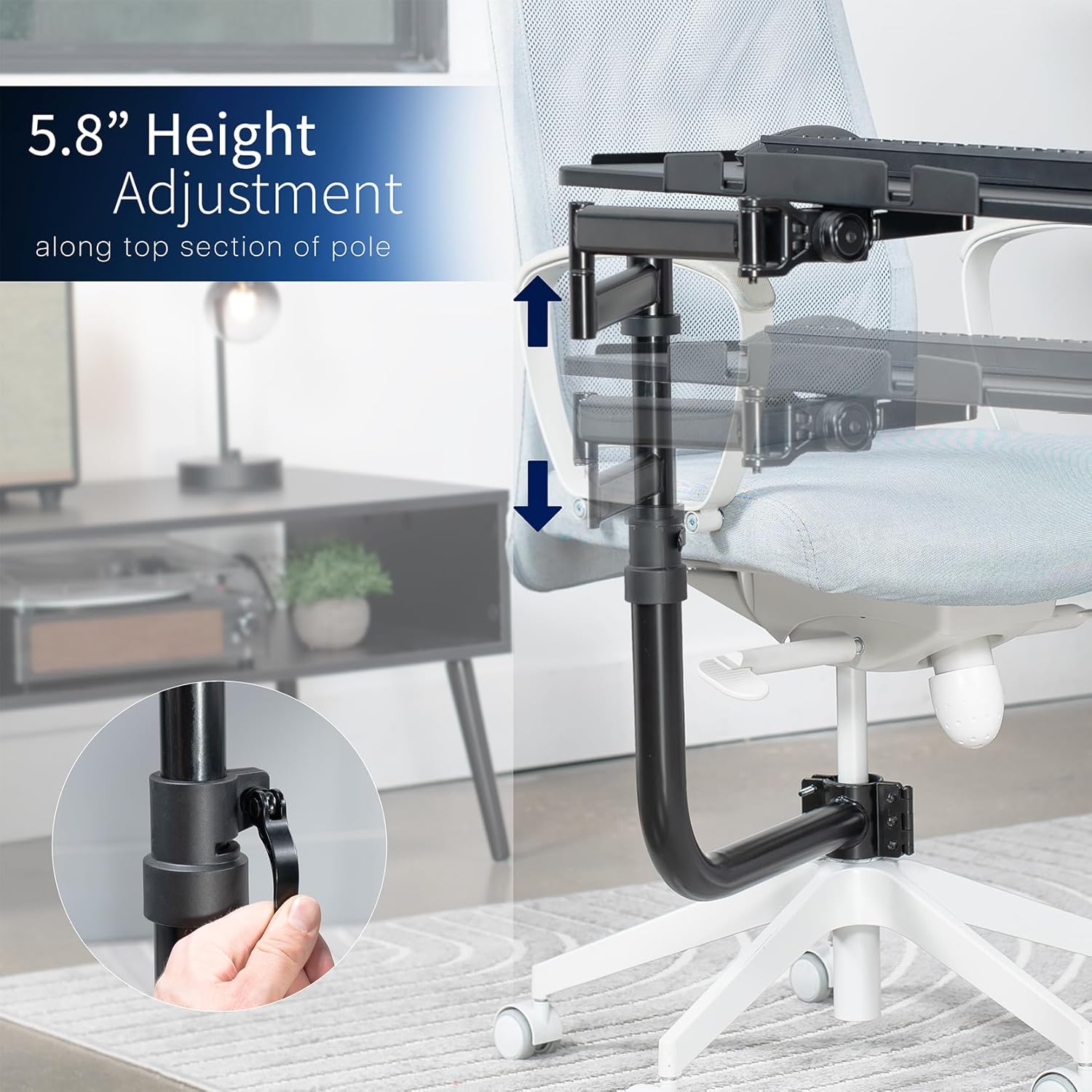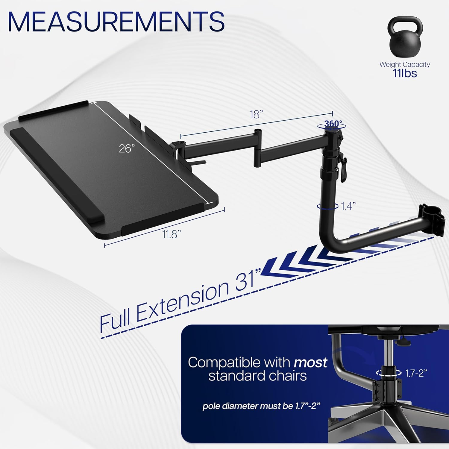 - Over Chair Keyboard Tray: Steel arm support attaches to the bottom tube section (1.7" to 2" in diameter) of a standard height adjustable office chair for ergonomic typing angles and customized placement --Patent Pending--