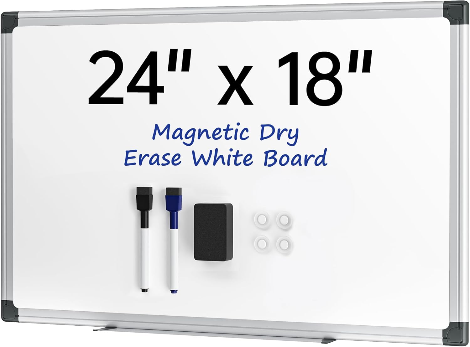 Magnetic White Board, 24 × 18 inches, Dry Erase Board for Wall, Silver Aluminium Frame, Hanging Whiteboard for Kids, Students, Office, Kitchen- Includes Markers, Magnets & Eraser