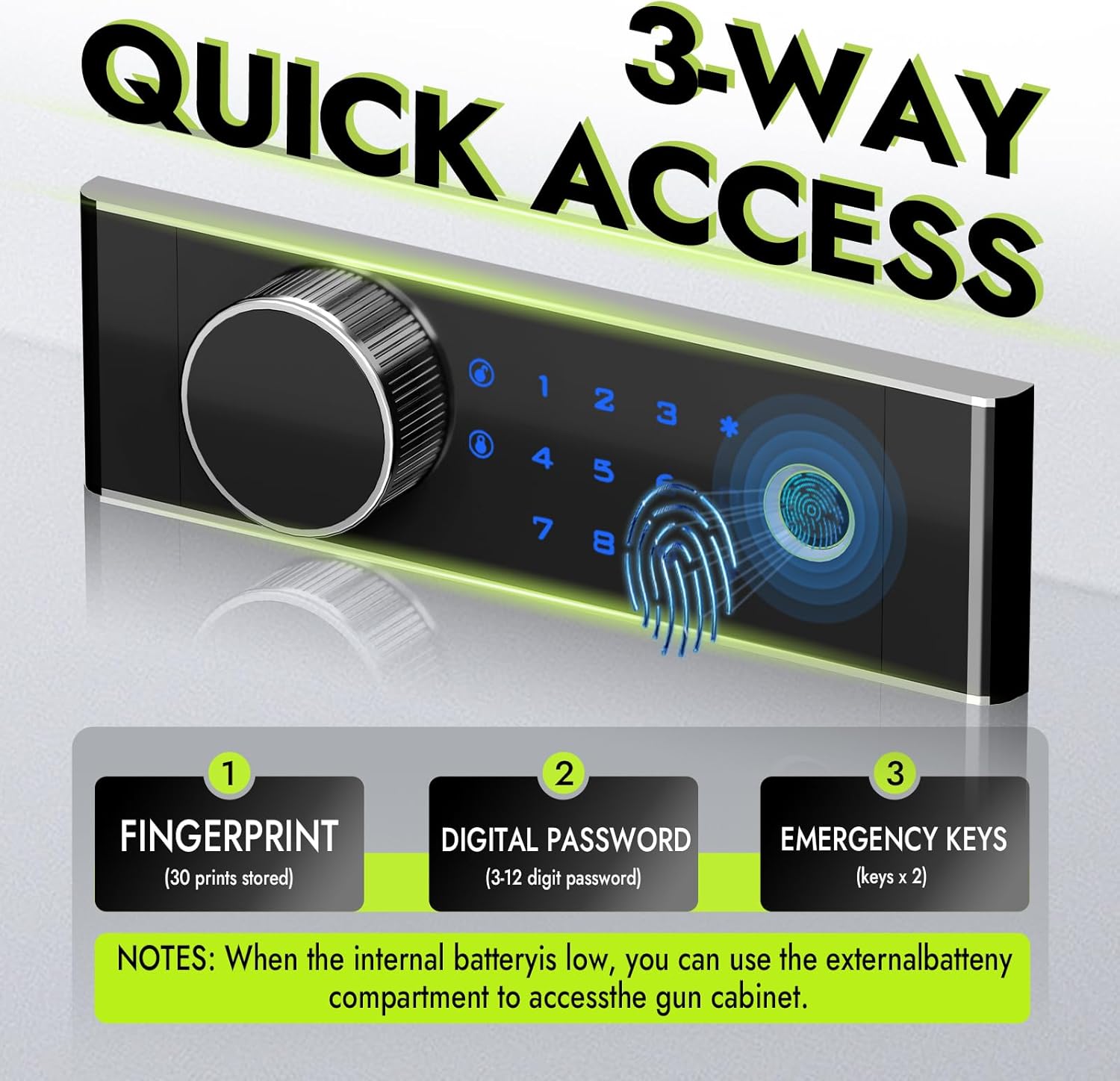 - [3 Ways To Open] 1. Equipped with tamper-proof digital keypad lock, you can set a 3--12-digit combination to prevent strangers from opening it at will; 2. Two emergency keys, which can be opened faster and more directly; 3. External battery box, you can enter the password to unlock the safe through the external battery box when the safe is out of power. Note: Do not put the emergency key in the safe. If you forget the password, you will not be able to open it